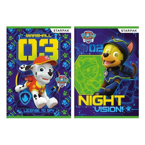 Zeszyt A5, 16 kartek w trzy linie kolorowe, w miękkiej oprawie. Oprawka zdobiona nadrukiem Paw Patrol. Zeszyt dostępny w dwóch wersjach graficznych.