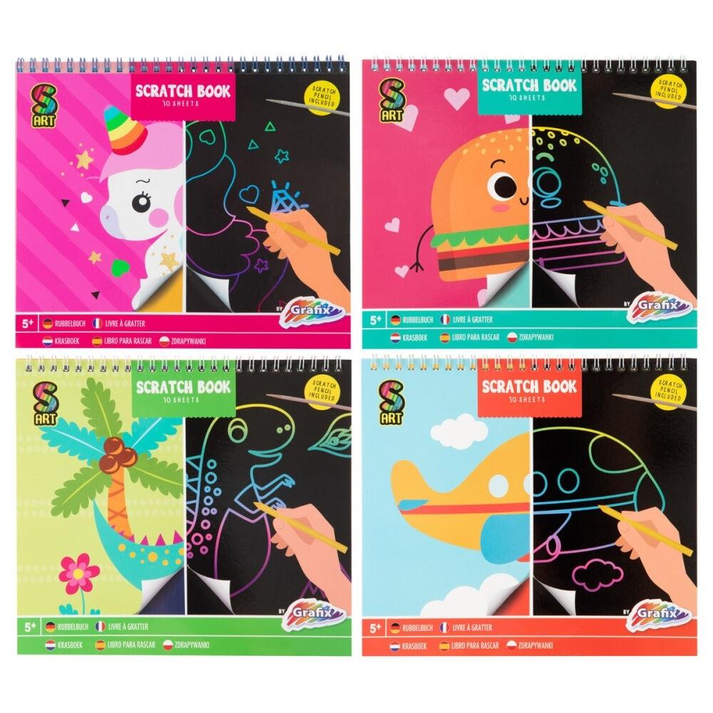 Dostępne są w 4x wersjach (Z samolotem, hamburgerem, jednorożcem i dinozaurem) - W każdej zdrapce znajduje się 10x arkuszy - Drewniany ołówek do zdrapywania - Arkusze mają wymiary 20x24 cm