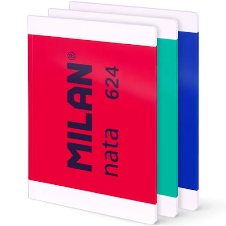 Zestaw 3 zeszytów notesów klejonych A4, papier w linię (7 mm), 48 kartek. Kolory: niebieski, zielony i różowy. Elastyczna kartonowa okładka w dwóch różnych wykończeniach - błyszczącym i matowym. Wysokiej jakości papier o gramaturze 95 gr/m2, mikroperforowany. Kolekcja MILAN nata(R) 624 inspirowana jest oryginalną kolorystyką i designem gumek MILAN produkowanych w Hiszpanii od 1918 roku.