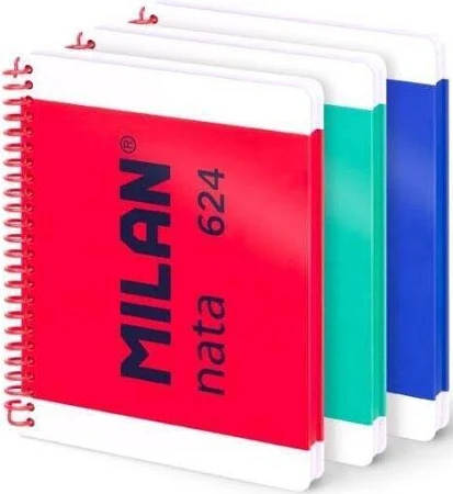 Zestaw 3 zeszytów notesów klejonych A4, papier w kratkę (5 x 5 mm), 48 kartek. Kolory: niebieski, zielony i różowy. Elastyczna kartonowa okładka w dwóch różnych wykończeniach - błyszczącym i matowym. Wysokiej jakości papier o gramaturze 95 gr/m2, mikroperforowany. Kolekcja MILAN nata(R) 624 inspirowana jest oryginalną kolorystyką i designem gumek MILAN produkowanych w Hiszpanii od 1918 roku.