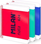 Zestaw 3 zeszytów notesów z metalową spiralą z zamknięciem w systemie coil-lock zapobiegającym zaczepianiu się o odzież lub zarysowaniom mebli. Papier A5 w kratkę (5 x 5 mm), 80 kartek. Kolory: niebieski, zielony i różowy. Sztywna kartonowa okładka w dwóch różnych wykończeniach - błyszczącym i matowym. Wysokiej jakości papier o gramaturze 95 gr/m2, z mikroperforacją oraz z 2 otworami. Rozcięcie przy perforacji ułatwiające rozdzielenie każdego arkusza. Kolekcja MILAN nata(R) 624 inspirowana jest oryginalną kolorystyką i designem gumek MILAN produkowanych w Hiszpanii od 1918 roku.