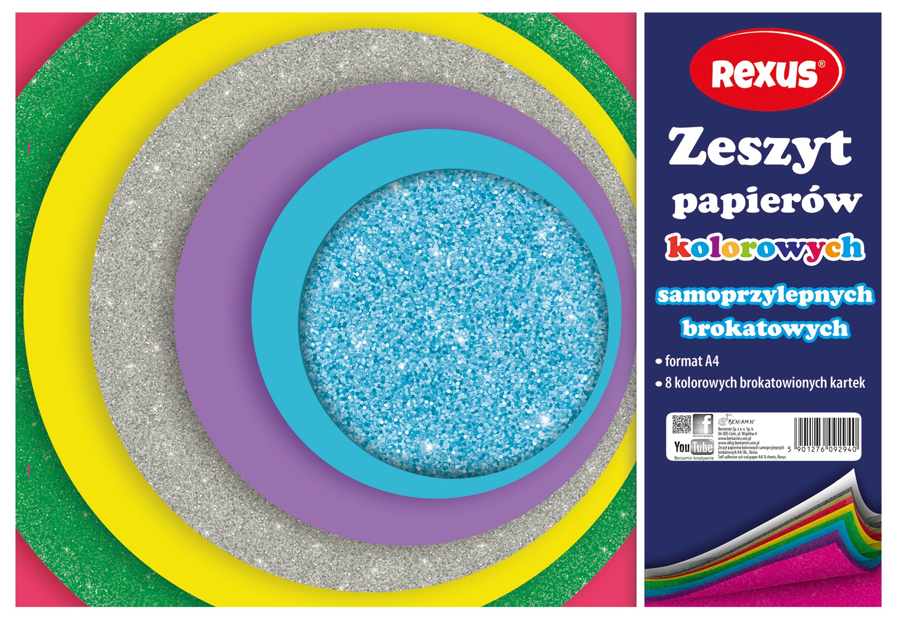 Zeszyt papierów kolorowych samoprzylepnych brokatowionych A4, zawiera 8 kolorowych kartek. Cechuje się duża gęstość brokatu. Na przedzie kolorowa okładka. Całość zszyta dwiema zszywkami płaskimi. Idealny do ozdabiania i prac manualnych.