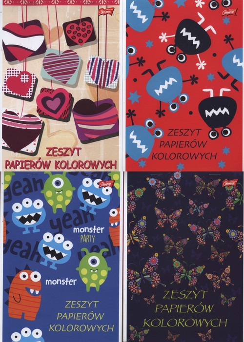 Zeszyt zawiera 10 kolorowych kartek. Zestaw kolorów to złoty, srebrny, żółty, pomarańczowy, czerwony, zielony, błękitny, fioletowy, brązowy i czarny. Okładka kredowa o gramaturze 115g/m2 wykorzystuje najnowsze motywy wzornicze UNIPAP.