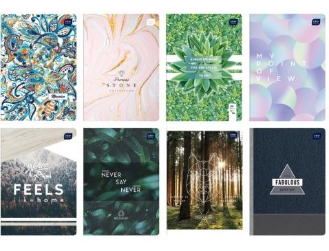 Okładka lakier UV Zaokrąglone rogi Posiada margines Zeszyty w intensywnych kolorystycznie grafikach, zaprojektowane zgodnie z aktualnymi trendami w designie i modzie Wysokiej jakości okładka zabezpieczona błyszczącym lakierem ochroni wszystkie ważne notatki Format A5 Zeszyt w linie UWAGA WZÓR WYBIERANY LOSOWO