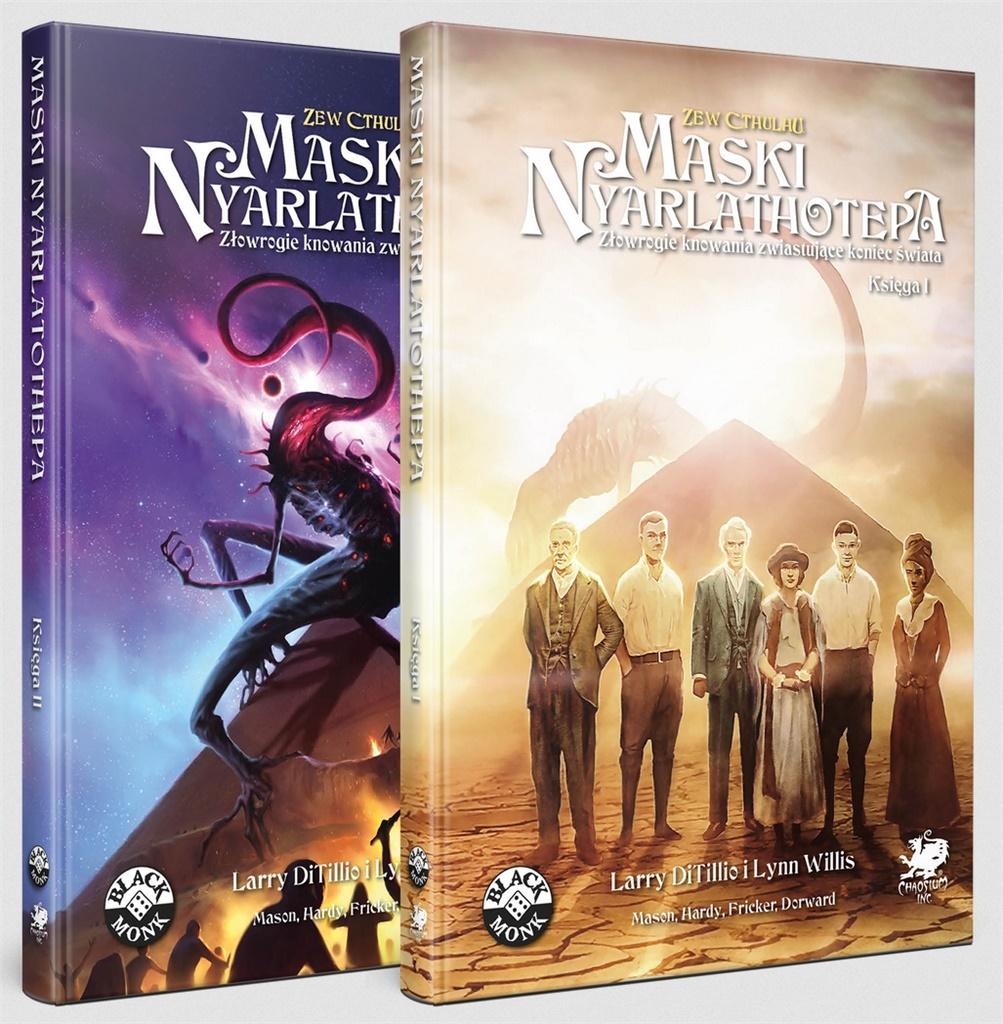 Maski Nyarlathotepa to spektakularna, wieloczęściowa kampania do Zewu Cthulhu! Badacze Tajemnic wyruszą w pełną niebezpieczeństw podróż przez sześć różnych kontynentów, by poznać prawdziwe losy zaginionej ekspedycji Rogera Carlyle'a. Dwa pięknie ilustrowane tomy wypełnione są dodatkowymi przygodami, detalami historyczno-geograficznymi i bluźnierczym okultyzmem. Kampania pozwala na poprowadzenie opowieści w klimacie klasycznego śledztwa, jak również w pulpowej wersji pełnej niespodziewanych zwrotów akcji. Niezłomni Badacze rzucą wyzwanie sługom ciemności, a od wyniku ich działań będą zależeć losy całej ludzkości!