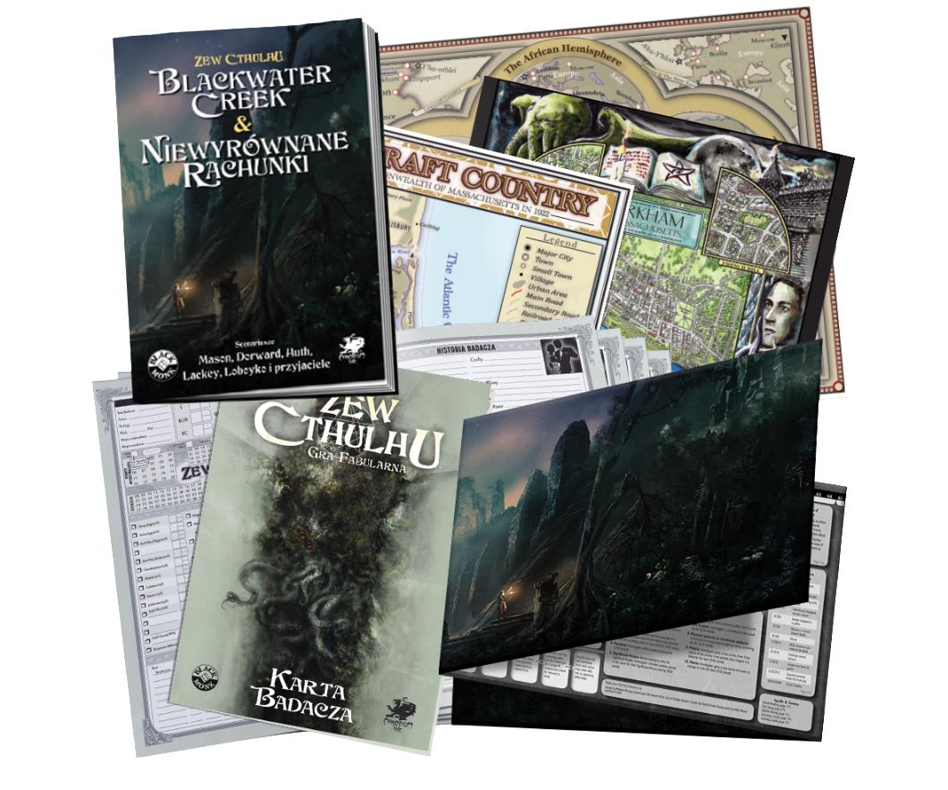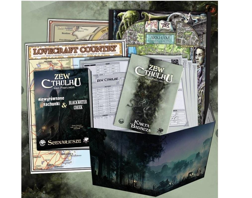 Dodatkowo zawiera 5 kart Badaczy i kolorowe Krainy Lovecrafta, Świata Cthulhu i Arkham i okolic.