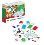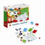 "Zgadnij i skojarz" to logopedyczna gra edukacyjna. Jej uczestnicy słuchają uważnie czytanych kolejno ( z kart) rymowanych zagadek. Każdy z graczy, który odgadł odpowiedź stara się jak najszybciej odnaleźć właściwy dla niej obrazek lezący na stole. Gracz, który pierwszy położy swój żeton na odpowiednim obrazku musi głośno wymówić jego nazwę. Zwycięzcą w grze zostaje ten, kto wskaże i wymówi prawidłowo najwięcej trafnych odpowiedzi. Gra jest pełną emocji zabawką, w której dzieci ćwiczą artykulację spółgłosek szeregu syczącego s-z-c-dz; ciszącego ś-ź-ć-dź; szumiącego sz-ż-cz-dż. Dzięki grze dzieci nie tylko trenują i utrwalają wymawianie głosek, ale także doskonałą koncentracje, refleks, spostrzegawczość, pamięć i umiejętność czytania, świetnie się przy tym bawiąc. Zawartość pudełka: 55 kart zagadek, 55 tabliczek z obrazkami, 40 kolorowych żetonów, instrukcja.