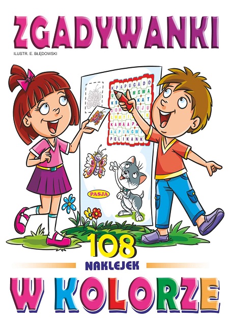 Książka edukacyjna z zadaniami logicznymi i naklejkami.