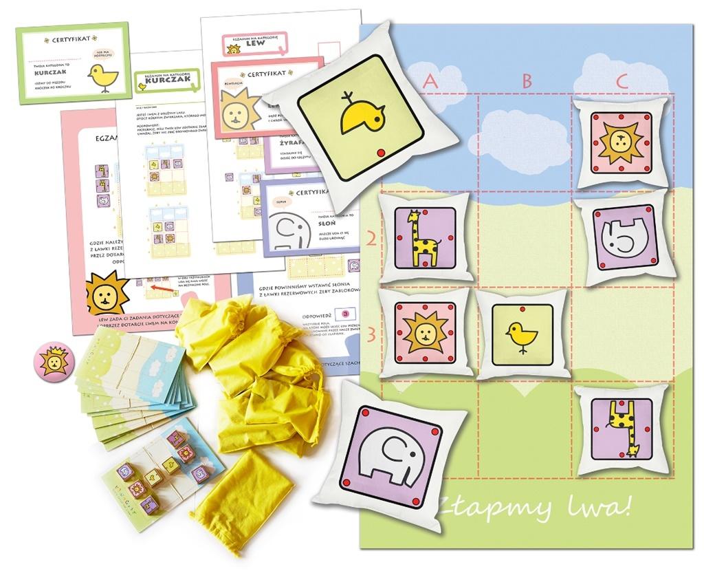 • grę wielkoformatowa - dywanową do zabawy grupowej; składa się z maty 1,5×2 m i 8 dużych miękkich poduszek,