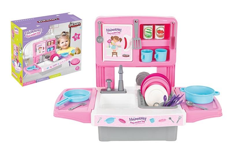W zestawie: zlewozmywak z kranem z którego leci woda, suszarka na naczynia, garnek, patelnia, sztućce, talerze, kubki, wym. Zestawu: 71 x 37 x 49 cm., 3+