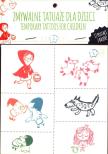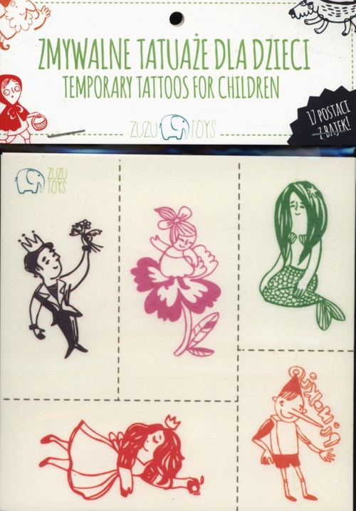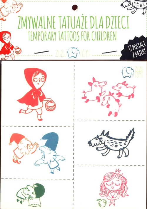 Zestaw 17 zmywalnych tatuaży dla dzieci przedstawiających postaci z bajek.Na 3 arkuszach m.in: Czerwony Kapturek i wilk, Jaś mi Małgosia, Trzy świnki, Calineczka, Brzydkie kaczątka i inne.Zmywalne tatuaże dla dzieci jak użyć?1. Zdejmij papier zabezpieczający2. Na umytą i wysuszoną skórę połóż kartonik wzorem do spodu3. Zmocz wodą powierzchnię kartonika i dociśnij go do skóry, przytrzymaj 30 sekund4. Delikatnie podnieś kartonik. Twój tatuaż jest gotowy5. Naniesiony na skórę tatuaż delikatnie opłucz wodą, aby go utrwalićIlustracje: Ola CieślakRozmiar arkusza: 12x12 cmTatuaże są bezpieczne i nietoksyczne. Klej użyty do produkcji tatuaży posiada certyfikat laboratorium badań dermatologicznych potwierdzający brak substancji drażniących.Produkt typu tatuaż kalkomania.Odpowiednie dla dzieci powyżej 3 roku życia.