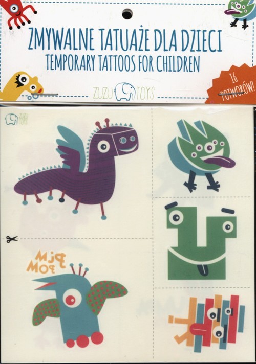 Zestaw 16 zmywalnych tatuaży dla dzieci przedstawiających sympatyczne potwory.?