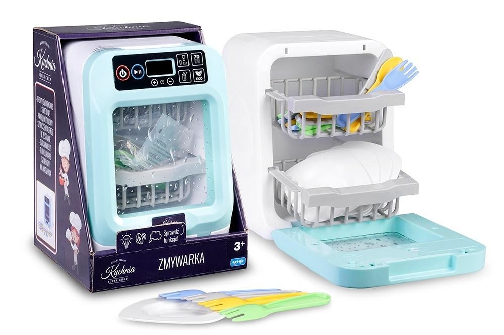 W zestawie: talerze, sztućce. Funkcje: dźwięk, światło, ustawianie czasu zmywania, dotykany panel, wysuwane szuflady.