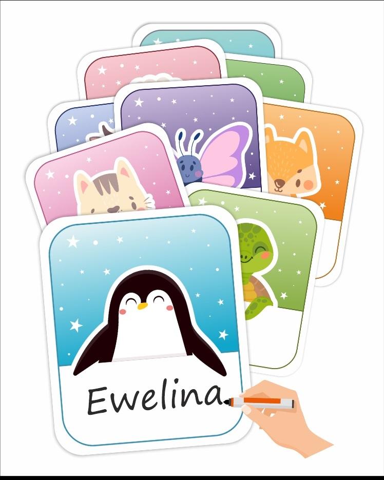 Na każdej karcie znajduje się inne zwierzątko, inny kolor, oraz miejsce na wpisanie imienia dziecka.