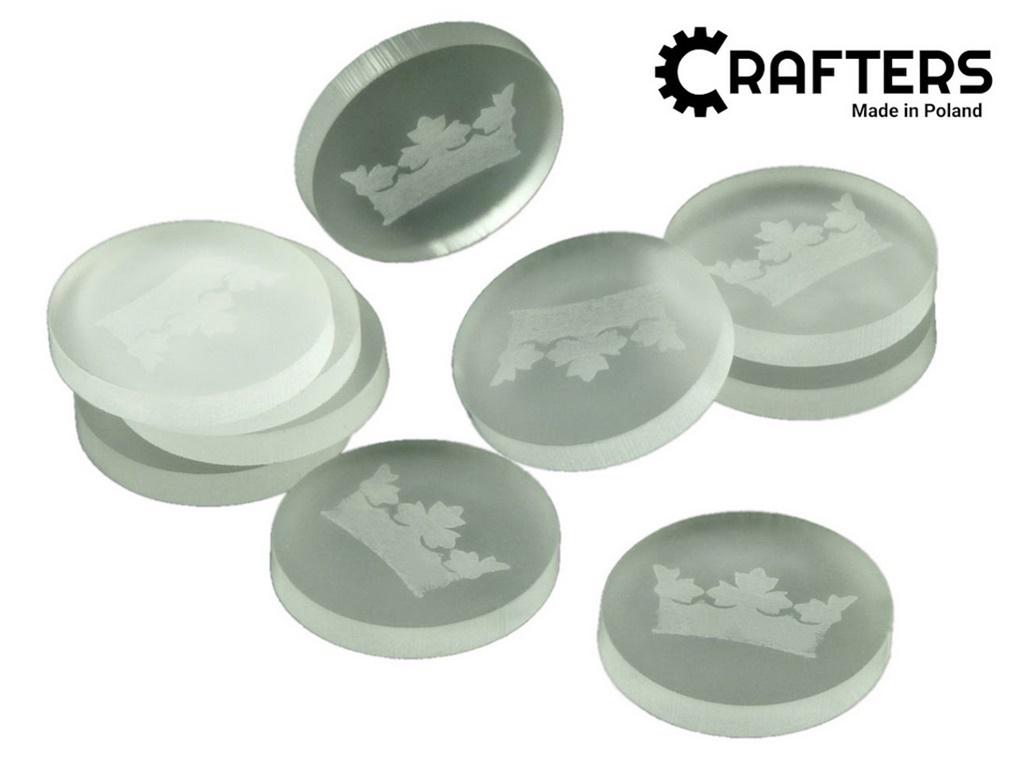 Żetony z wygrawerowaną grafiką korony, wykonane ze szkła akrylowego satynowego, o grubości 3 mm, średnica żetonu wynosi 22 mm. W opakowaniu jest 10 żetonów. Użyteczne w grach bitewnych, RPG, grach Print & Play, w prototypach gier planszowych, jako zamienniki elementów oraz przy wprowadzaniu własnych modyfikacji zasad do gier.