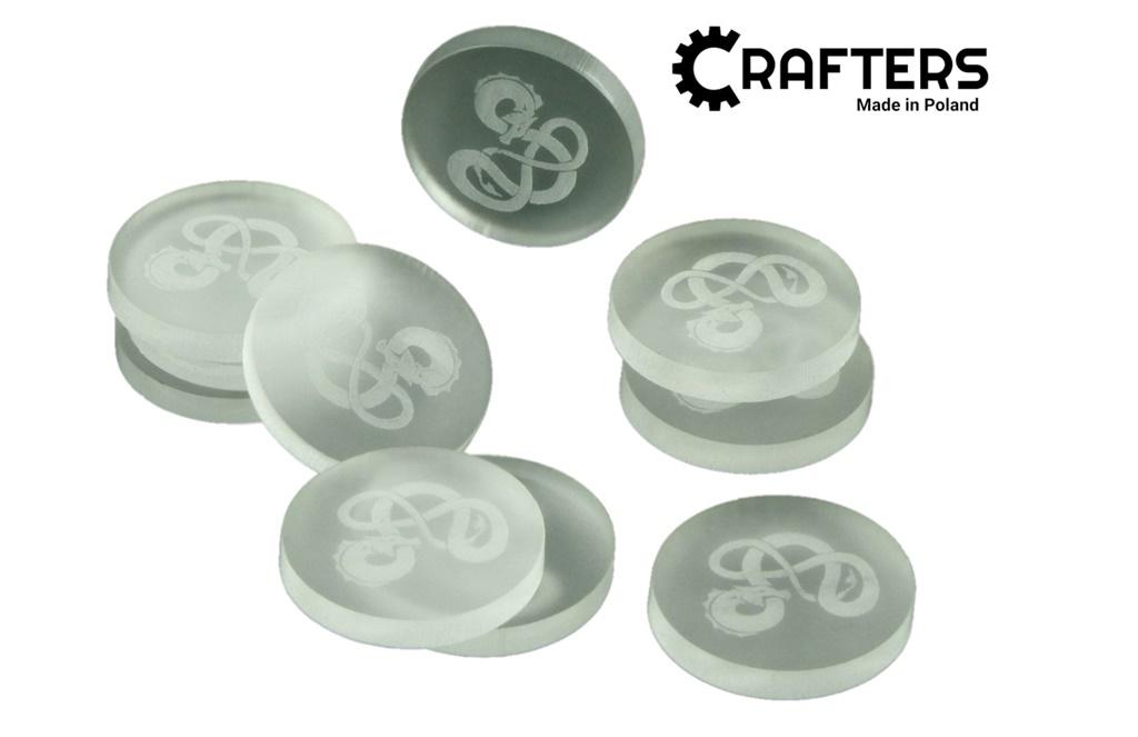 Żetony z wygrawerowaną grafiką smoka w drugiej wersji, wykonane ze szkła akrylowego satynowego, o grubości 3 mm, średnica żetonu wynosi 22 mm. W opakowaniu jest 10 żetonów. Użyteczne w grach bitewnych, RPG, grach Print & Play, w prototypach gier planszowych, jako zamienniki elementów oraz przy wprowadzaniu własnych modyfikacji zasad do gier.