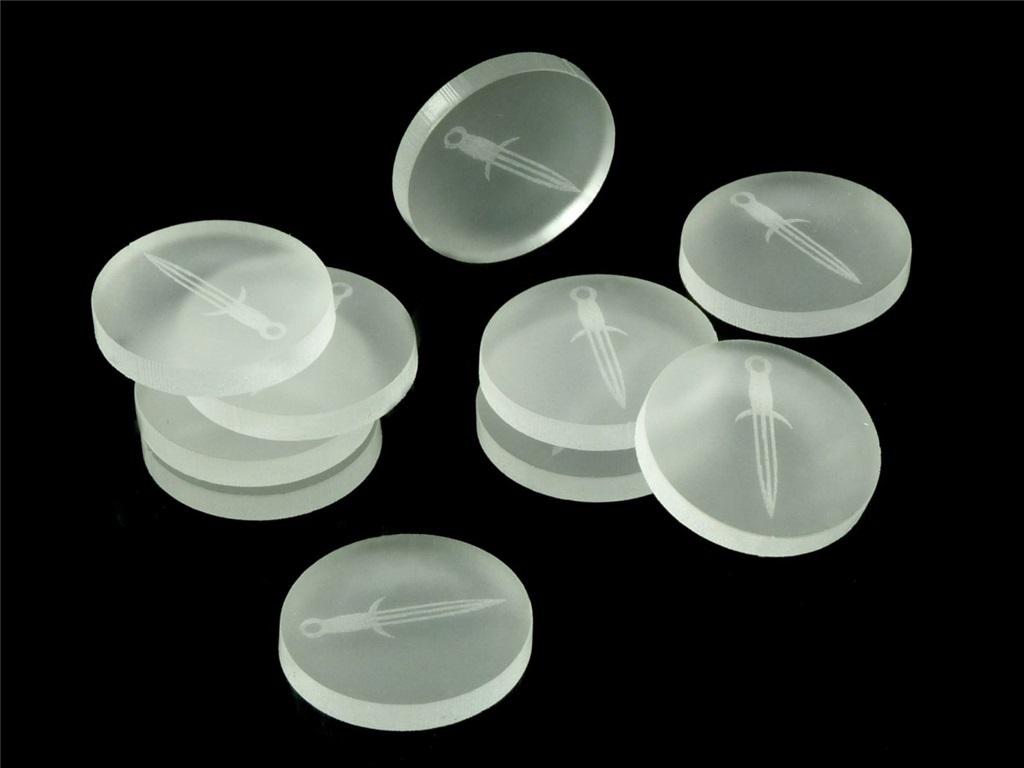 Zestaw 10 żetonów o średnicy 22 mm, wykonanych ze szkła akrylowego o grubości 3 mm.