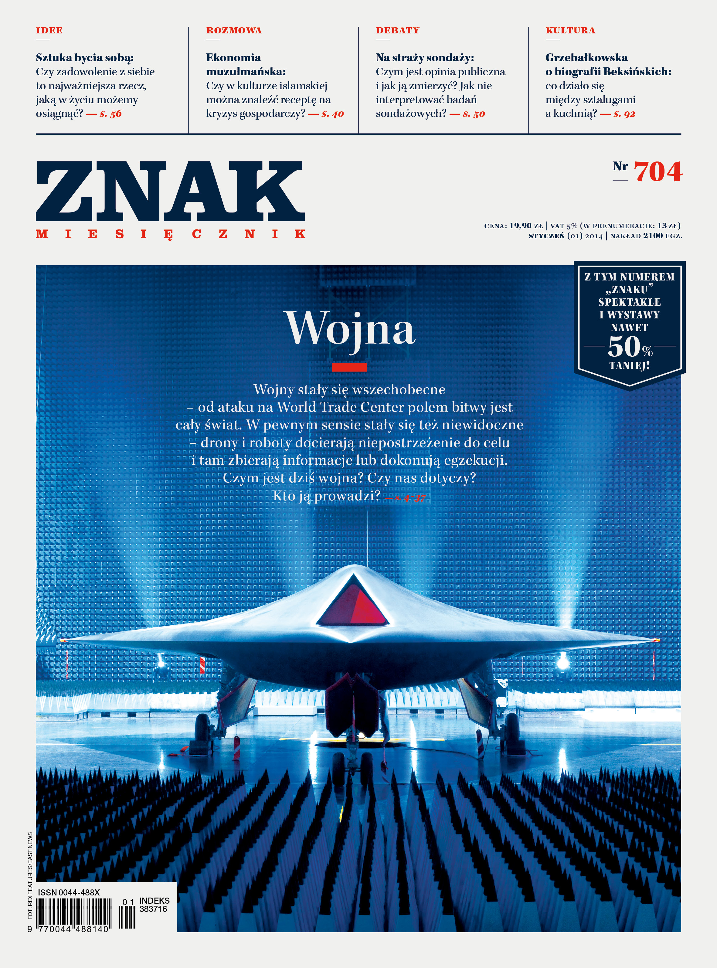 Temat Miesiąca: Wojna Wojny stały się wszechobecne – od ataku na World Trade Center polem bitwy jest cały świat. W pewnym sensie stały się też niewidoczne – drony i roboty docierają niepostrzeżenie do celu i tam zbierają informacje lub dokonują egzekucji. Czym jest dziś wojna? Czy nas dotyczy? Kto ją prowadzi? Fotoreportaż Claire Felicie Oto są młodzi mężczyźni o holenderskich żołnierzach służących w Afganistanie. Idee: Sztuka bycia sobą: Czy zadowolenie z siebie to najważniejsza rzecz, jaką w życiu możemy osiągnąć? Rozmowa: Ekonomia muzułmańska: Czy w kulturze islamskiej można znaleźć receptę na kryzys gospodarczy? Debaty: Na straży sondaży: Czym jest opinia publiczna i jak ją zmierzyć? Jak nie interpretować badań sondażowych? Kultura: Grzebałkowska o biografii Beksińskich: co się działo między sztalugami a kuchnią?