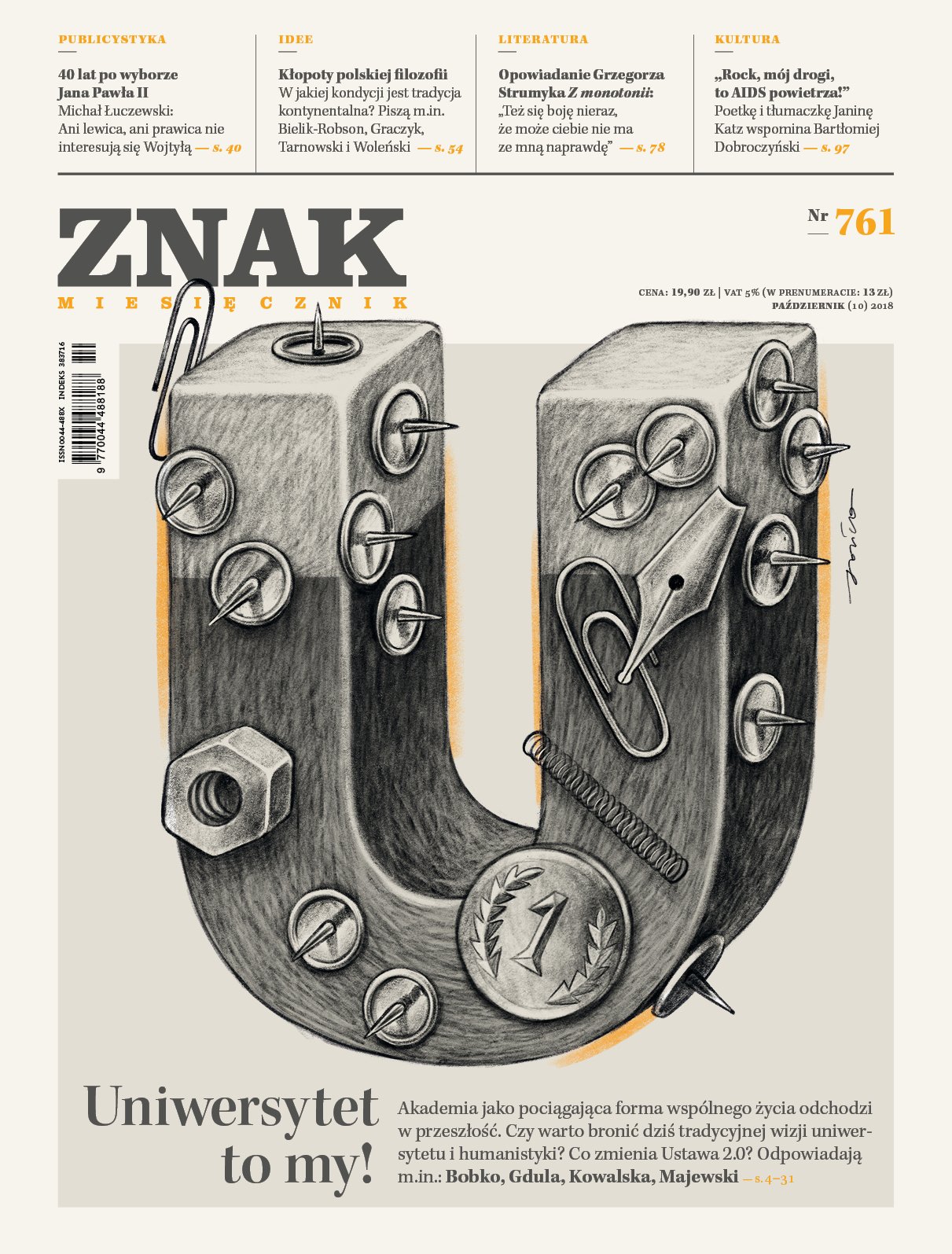 Uniwersytet to my! Akademia jako pociągająca forma wspólnego życia odchodzi w przeszłość. Czy warto bronić dziś tradycyjnej wizji uniwersytetu i humanistyki? Co zmienia Ustawa 2.0? Dlaczego na uczelniach wybuchły protesty? W Temacie Miesiąca: Nowa idea uniwersytetu Tomasz Majewski Krytyczny przewodnik po zmianach na uniwersytecie Przemysław Czechanowski, Piotr Drygas Krajobraz po nowej ustawie Dyskusja z udziałem: Aleksandra Bobko, Macieja Gduli, Cezarego Kościelniaka, Małgorzaty Kowalskiej Ponadto w numerze: W lipcu 2018 r. Meksyk wybrał pierwszego lewicowego prezydenta w historii. Do urn poszła rekordowo duża liczba Meksykanów Ola Synowiec 40 lat po wyborze Jana Pawła II: Ani lewica, ani prawica nie interesują się Wojtyłą Michał Łuczewski w rozmowie z Michałem Jędrzejkiem Kłopoty polskiej filozofii. W jakiej kondycji jest tradycja kontynentalna? Piotr Augustyniak, Joanna Bednarek, Agata Bielik-Robson, Piotr Graczyk, Karol Tarnowski i Jan Woleński „Rock, mój drogi, to AIDS powietrza!” Poetkę i tłumaczkę Janinę Katz wspomina Bartłomiej Dobroczyński Stacja: Literatura – Opowiadanie Grzegorza Strumyka „Z monotonii”