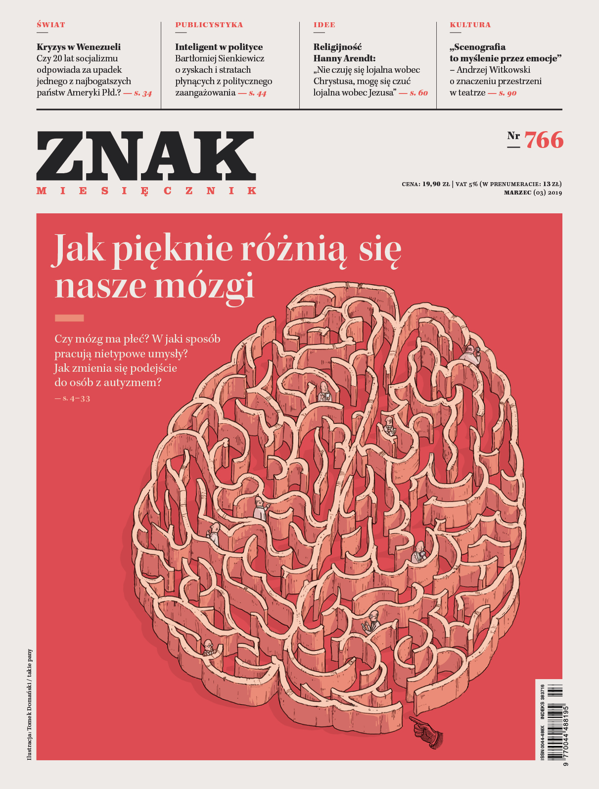 Jak pięknie różnią się nasze mózgi Rozwój nowoczesnych metod obrazowania pozwala coraz lepiej badać budowę i działanie ludzkiego mózgu. Wiemy, że pod wpływem wielu czynników – m.in. wieku, diety czy stylu życia – zmienia się mózg każdego z nas. Na dostosowanie się do nowych, nawet bardzo trudnych warunków, pozwala mu niezwykła plastyczność. Coraz lepiej zaczynamy także rozumieć, jak pracują tzw. nietypowe mózgi, np. osób z zaburzeniami, które doświadczają rzeczywistości w inny sposób, niż osób neurotypowych. Poznanie tej odmiennej perspektywy umożliwia znacznie bogatsze spojrzenie na otaczający nas świat. Czy mózg ma płeć? Dlaczego potrzebujemy bogactwa neuroróżnorodności? W jaki sposób pracują nietypowe umysły? Jak zmienia się podejście do osób z autyzmem? W Temacie Miesiąca: Lekcja mistrza zen Włodzisław Duch w rozmowie z Anną Mateją Mózg kobiecy, mózg męski? Zbigniew Sołtys Neuroróżnorodni. Jak zmieniało się myślenie o autyzmie Ewa Furgał Nietypowe światy Olivera Sacksa Michał Jędrzejek Ponadto w numerze: „Nie czuję się lojalna wobec Chrystusa, mogę się czuć lojalna wobec Jezusa” Hannah Arendt Kryzys w Wenezueli. Czy 20 lat socjalizmu odpowiada za upadek jednego z najbogatszych państw Ameryki Płd.? – Joanna Gocłowska-Bolek Inteligent w polityce. O zyskach i stratach płynących z politycznego zaangażowania Bartłomiej Sienkiewicz w rozmowie z Andrzejem Brzezieckim „Scenografia to myślenie przez emocje”. O znaczeniu przestrzeni w teatrze Andrzej Witkowski w rozmowie z Katarzyną Pawlicką Stacja: Literatura – Opowiadanie Jakuba Kornhausera „Dekada w żyznym kraju”