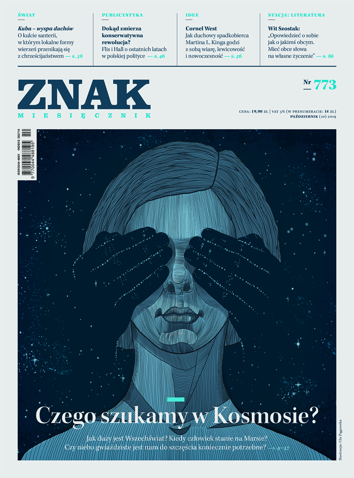 Czego szukamy w Kosmosie? Istniejemy „dla oglądania nieba i ładu, jaki panuje w całym Wszechświecie” – powiedzieć miał Anaksagoras pytany o sens życia. Greckie słowo „Kosmos” to dosłownie „dobry ład”. Używane także w kontekście retoryki, moralności czy mody, od czasów pitagorejczyków oznacza całość świata charakteryzującą się pięknem i porządkiem. Nowożytne odkrycie niewyobrażalnej wielkości Wszechświata budziło także inne uczucia – Pascal pisał o przerażeniu wobec „wiekuistej ciszy tych nieskończonych przestrzeni”. Do dziś pytani o to, czym jest doświadczenie metafizyczne – zarówno to pełne harmonii, jak i budzące niepokój – myślimy często o patrzeniu na rozgwieżdżone niebo. Kosmos rozbudza ciekawość, nadaje jednostkowemu życiu właściwe proporcje, a od czasów sputnika i misji Apollo obiecuje przygodę i odkrywanie nowych światów. W Temacie Miesiąca: Jak duży jest Wszechświat? Kiedy człowiek stanie na Marsie? Czego nas uczy kosmiczna perspektywa? Dlaczego chcemy oglądać gwiazdy? Ponadto w numerze: Kuba - wyspa duchów O kulcie santerii, w którym lokalne formy wierzeń przenikają się z chrześcijaństwem Dokąd zmierza konserwatywna rewolucja? Flis i Hall o ostatnich latach w polskiej polityce Cornel West Jak duchowy spadkobierca Martina L. Kinga godzi z sobą wiarę, lewicowość i nowoczesność Wit Szostak: "Opowiedzieć o sobie jak o jakimś obcym. Mieć obce słowa na własne życzenie"