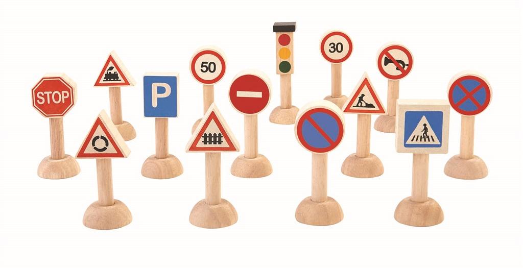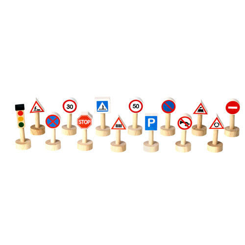 Zestaw 14 znaków drogowych do ustawiania przy ulicach miasteczka. Wspólna zabawa uczy dziecko rozpoznawania znaków drogowych, może być doskonałą okazją do omówienia zasad bezpiecznego poruszania się po ulicy. 3+
