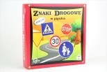 Gra zawiera 30 okrągłych kart z rysunkami związanymi z wiedzą o znakach drogowych.