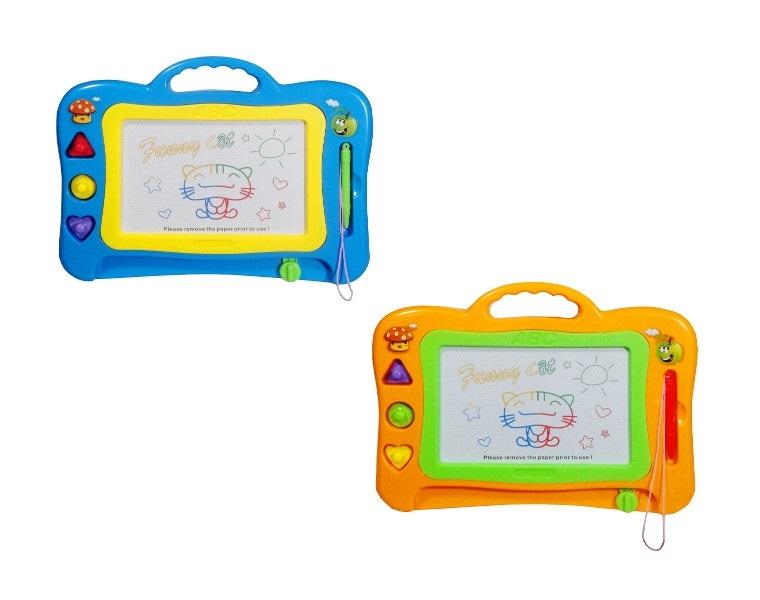 Tablica do pisania i rysowania. Znikopis zawiera długopis. Malunki można łatwo usunąć, przesuwając suwak zmazujący. W zesatwie również 3 stemple. Produkt zapakowany w przezroczysty worek. Zabawka dla dzieci od 3 lat. Produkt występuje w kilku wersjach kolorystycznych, wybierany losowo. Cena dotyczy jednej sztuki.