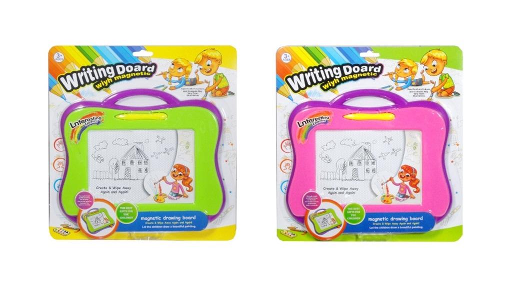 Tablica do pisania i rysowania. Znikopis posiada długopis. Malunki można łatwo usunąć, przesuwając suwak zmazujący. Produkt zapakowany w kartonowe opakowanie z przezroczystym okienkiem. Produkt dla dzieci od 3 lat. Podane wymiary są wymiarami opakowania. Produkt występuje w kilku wersjach kolorystycznych, wybierany losowo. Cena dotyczy jednej sztuki.