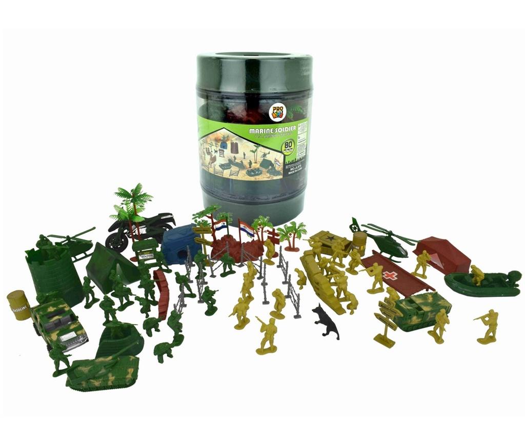 Idealny zestaw, aby stworzyć własne pole bitwy w zaciszu swojego pokoju! Twórz strategie, obmyślaj, jak ustawić swoich żołnierzy, aby pokonać w sprytny sposób swojego przeciwnika. Plastikowe żołnierze to idealna zabawka dla dużych jak i małych chłopców oraz dziewczynek dla których świat wojska, misji i tajnych zadań jest idealnym miejscem, gdzie można rozwijać swoje umiejętności logicznego myślenia, przewidywania i budowania strategii. Każdy z nas jest w środku małym żołnierzem! Zawiera: Łącznie 80 elementów. Wiaderko wypełnione żołnierzykami, pojazdami, elementami obronnymi jak okopy, zasieki, bazy wojskowe oraz wile dodatków.
