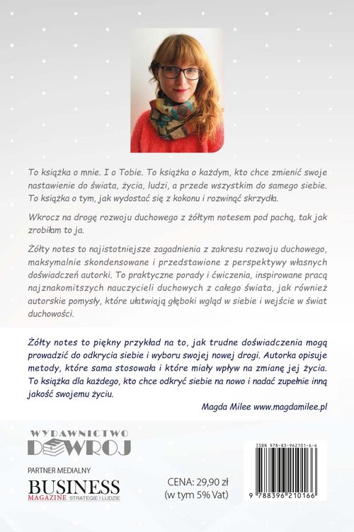Żółty notes to najistotniejsze zagadnienia z zakresu rozwoju duchowego, maksymalnie skondensowane i przedstawione z perspektywy własnych doświadczeń autorki. To praktyczne porady i ćwiczenia, inspirowane pracą najznakomitszych nauczycieli duchowych z całego świata, jak również autorskie pomysły, ułatwiające głęboki wgląd w siebie i gładkie wejście w świat duchowości."