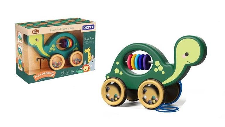 Kolorowy żółwik do ciągnięcia. W kołach zabawki znajdują się kolorowe kulki, które wydają dźwięki i pełnią funkcję grzechotki. Wewnątrz żółwika znajdują się także kolorowe obręcze, które dziecko może przesuwać. Zabawka zapakowana w kartonowe opakowanie z przezroczystym okienkiem. Zabawka dla dzieci od 18 miesiąca życia. Podane wymiary są wymiarami zabawki.