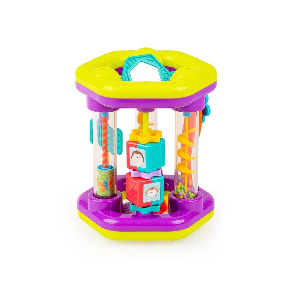 Jedna zabawka, w której kryje się cała masa atrakcji dla bobasa! Na każdej ze ścianek Rolusia znajduje się inna zabawa, aktywizująca małe rączki. Znajdziemy tu kwiatek do przesuwania, obrazki zwierzątek do obracania, grzechotki, bezpieczne lusterko, a nawet zjeżdżalnie z koralikami. Wszystkie te ruchome i grzechoczące elementy mają za zadanie jak najlepiej stymulować zmysły maluszka, zachęcając go przy tym do aktywnej, sensorycznej zabawy!