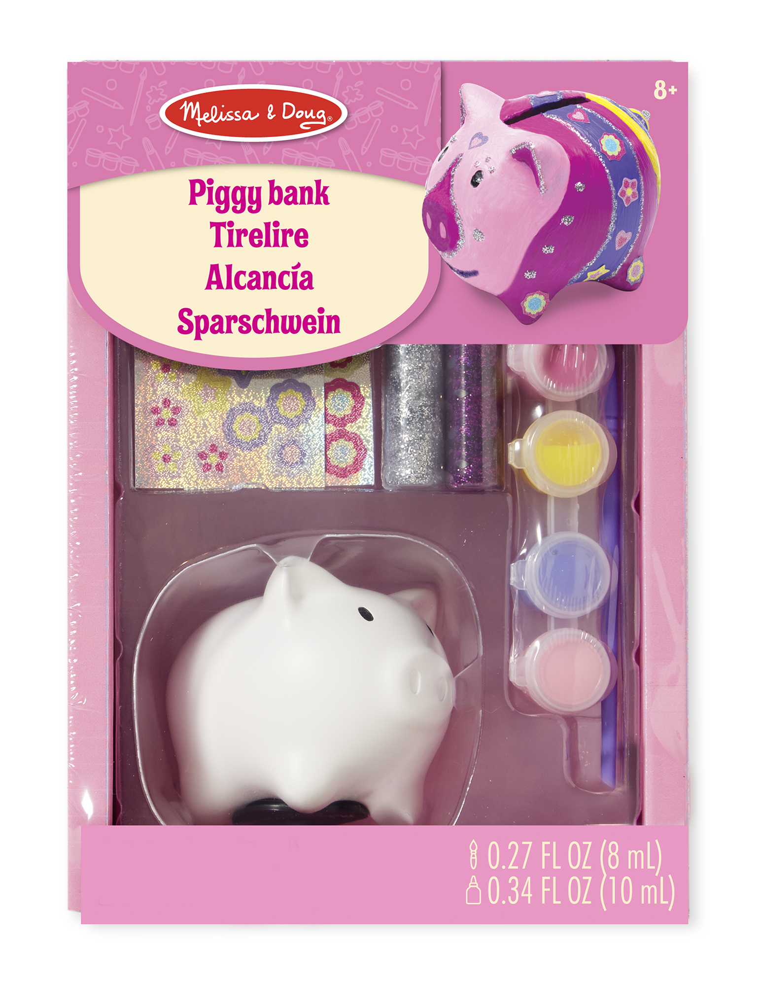 Świnka skarbonka mobilizuje do zbierania i oszczędzania pieniędzy. Zestaw składa się z niepomalowanej świnki skarbonki, 54 naklejek, kleju, brokatów, pędzelka, farbek, kleju. Świnkę można dowolnie przyozdobić tak żeby jej widok i widmo oszczędzania kojarzyło nam się z wizją przyszłej nagrody. Zabawka rozwija zdolności manualne dziecka, daje możliwość twórczego rozwoju i ćwiczy małe rączki.