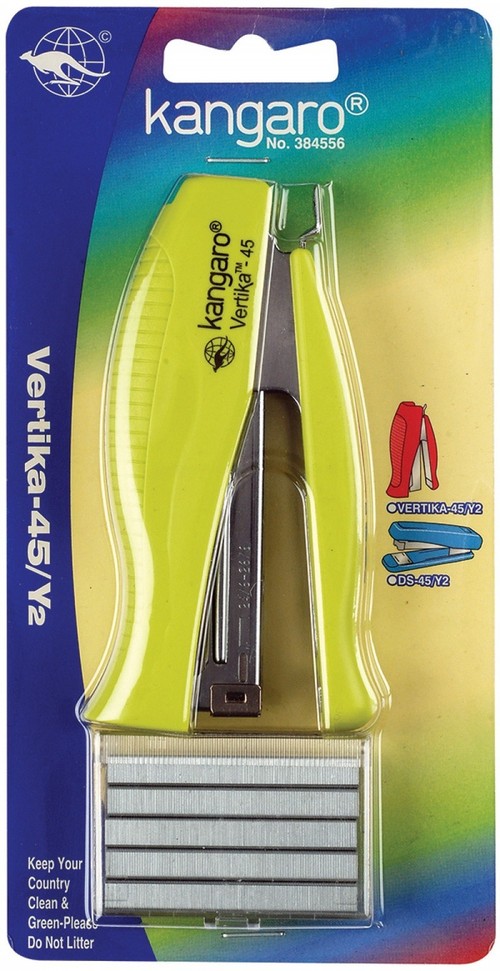 zszywacz Kangaro Vertika-45 jest niezastąpiony w biurze i w domu zszywanie klasyczne i tapicerskie zszywacz można postawić na 3 sposoby (np. pionowo, co zajmie mniej miejsca) oznaczenie rozmiaru pasujących zszywek na mechanizmie zszywającym nazwa producenta i model trwale naniesiony przez producenta na obudowie wykonany jest z wytrzymałego plastiku i metalu, co nie tylko zapewnia dużą wytrzymałość, ale jest również wygodne w użyciu posiada mechanizm szybkiego doładowywania wbudowany rozszywacz i wskaźnik zużycia zszywek atrakcyjnie zapakowane w blister zszywki: 24/6 ~ 26/6 pojemność: 50/100 zszywek zszywa: do 30 kartek głębokość wsunięcia kartki: 64mm 10 lat gwarancji komplet zszywek GRATIS kolor zielony