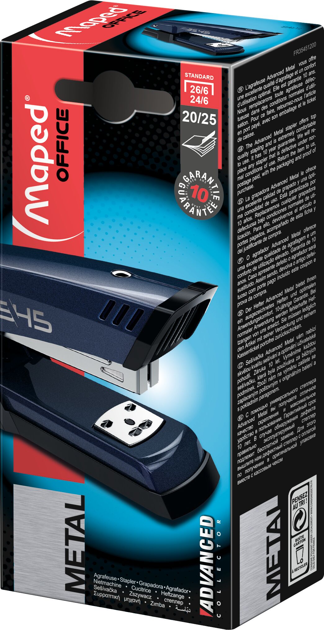 Zszywacz ADVANCED METAL. Metalowa obudowa. Metalowy mechanizm zapobiegający blokowaniu i zacinaniu się zszywacza. Krótki magazynek, do 25 kartek. Trzy rodzaje zszywania: zamknięte, otwarte i tapicerskie. Otwierają się o 180 stopni, co ułatwia ładowanie zszywek. Dodatkowa komora na zapasowe zszywki pod magazynkiem. Opakowanie dostosowane graficznie do prezentacji w poziomie i w pionie na hakach. Głębokość zszywania 52 mm. Pojemność magazynka 100 zszywek 24/6 lub 140 zszywek 26/6. Kolor granatowy metaliczny. Gwarancja 10 lat. JS 1 szt.