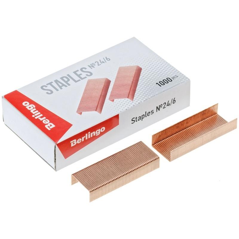 Zszywki miedziane Berlingo nr 24/6. Zszywki pakowane są w kartonowe pudełko po 1000 sztuk. Wykonane z drutu stalowego pokrytego miedzią, zszywki niezawodnie zszywają do 30 arkuszy.