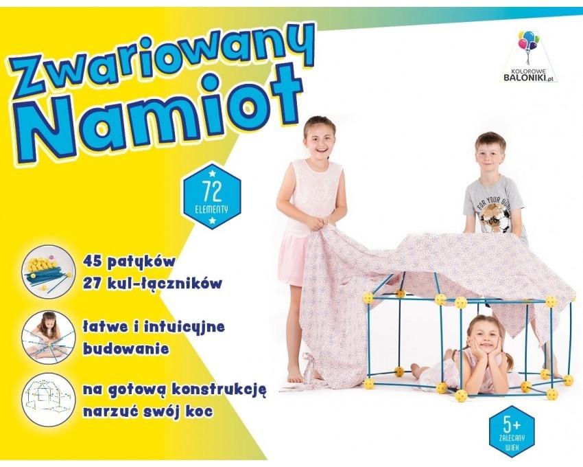 Zwariowany Namiot to zabawka konstrukcyjna z której można w łatwy i szybki sposób budować duże, wytrzymałe, łatwe do przenoszenia, świetne w zabawie kompozycje jak igloo, domek, zamek, wieża, tunel, które można przykryć kocem lub innym materiałem. Konstrukcje są tak duże, że dzieci mogą się w nich bawić.