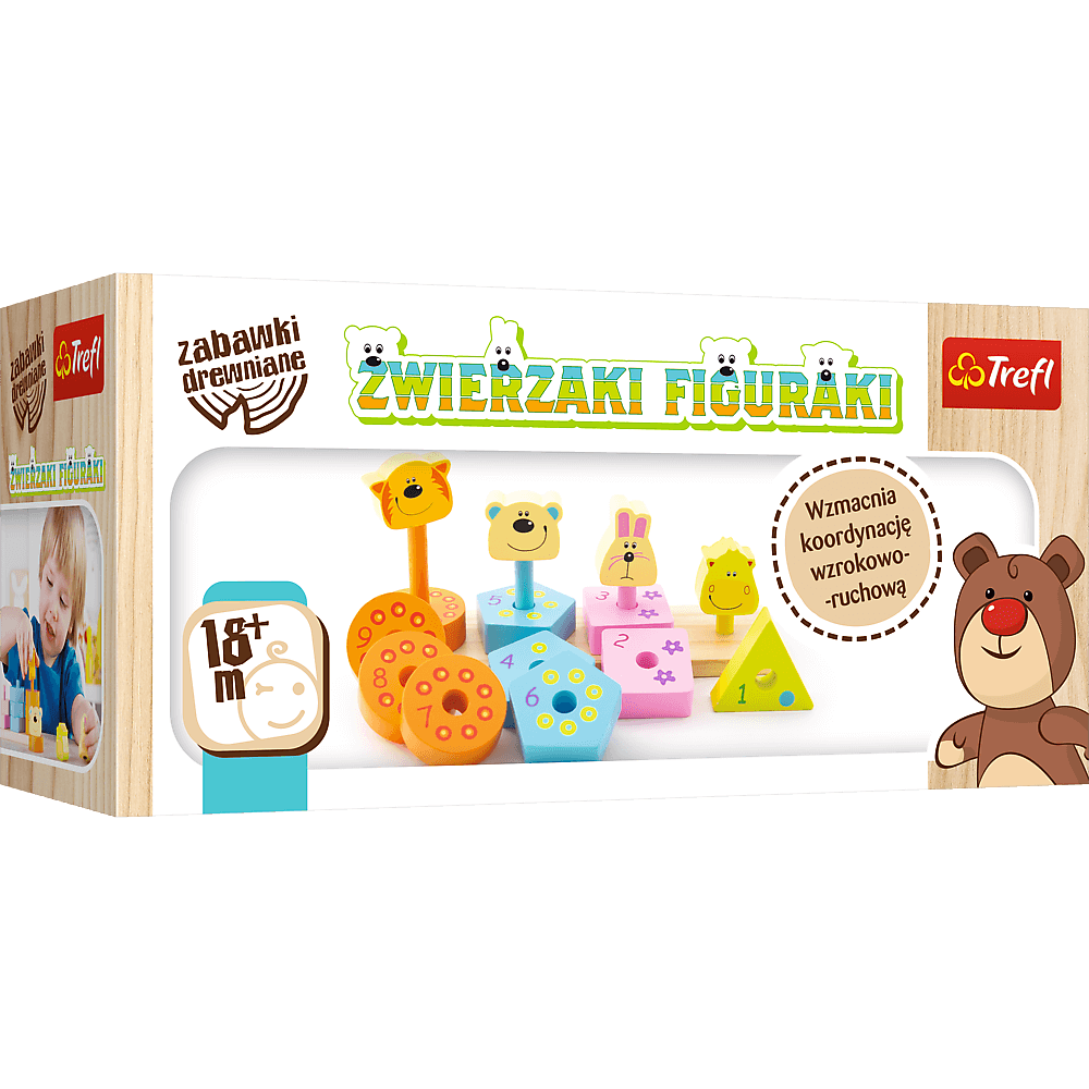 Uśmiechnięte zwierzaki wykonane z jasnego, naturalnego drewna są doskonałą zabawką ogólnorozwojową