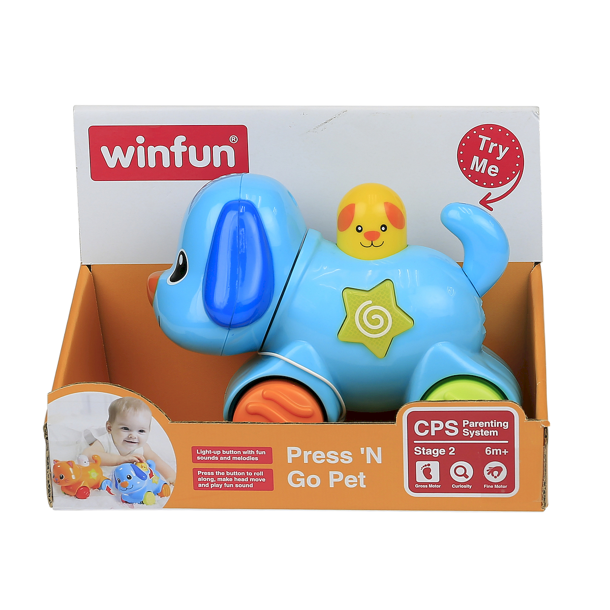 • Maluch chętnie podąży za grającym pieskiem, ćwicząc mięśnie i utrzymywanie kierunku ruchu podczas raczkowania.