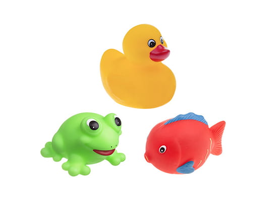 Zestaw kolorowych przyjaciół- rybka, kaczuszka, żabka  uwielbiają wodne zabawy z Twoim dzieckiem.