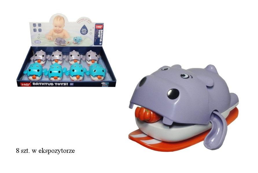 Zwierzątko hipopotam pływający na desce. Z jego pyska wystaje marchewka, którą należy pociągnąć wtedy zwierzątko zaczyna machać rękami, co będzie sprawiać, że będzie poruszać się w wodzie. Produkt dostępny w kilku wersjach kolorystycznych, wybierany losowo. Cena dotyczy jednej sztuki. Zabawka przeznaczona dla dzieci od 3 lat.