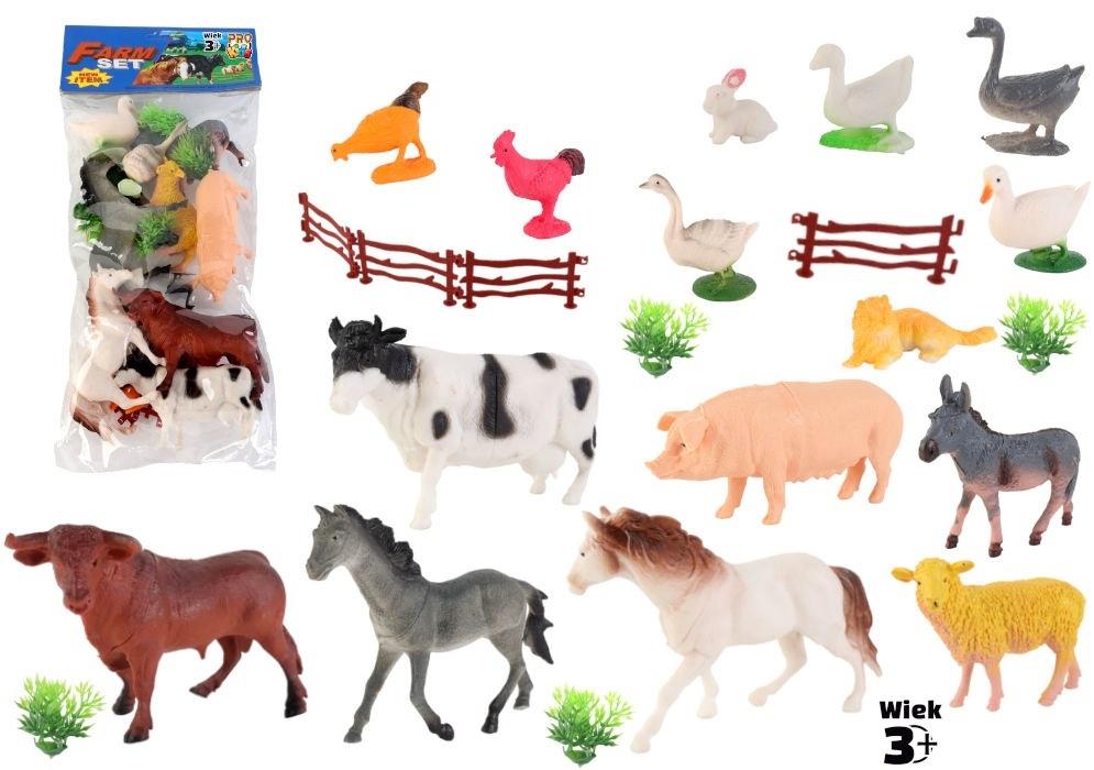 - 15 x figurka tj. krowa, koń x 2, byk, osiołek, świnia, owca, kura, kogut, kaczka x 2, gęś x 2, kot, królik,