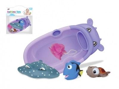 Zestaw zabawek do kąpieli. Wanienka z głową hipopotama, a także 3 piszczki płaszczka, żółw, rybka oraz mała myjka. Produkt zapakowany w przezroczysty worek. Produkt dla dzieci od 3 lat. Podane wymiary są wymiarami opakowania.