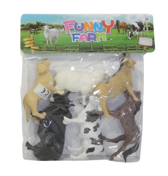Zestaw figurek zwierząt, które można znaleźć na farmie. W zestawie znajduje się 6 figurek m.in.: krowa, koń, koza, owca, żubr, pies.#&Produkt zapakowany w przezroczysty worek.